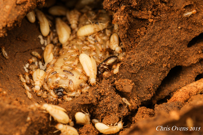 The termites reacted immediately to our intrusion, trying to protect their queen. We placed her back in her chamber and the termites immediately covered her with their own bodies, presumably to try and regulate her temperature. Queen termites react very badly to changes in temperature as they are used to a very carefully regulated environment deep within the termite mound.